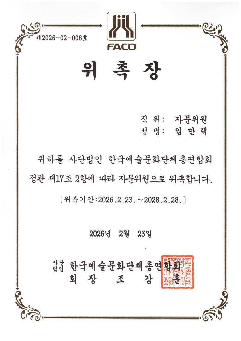 이번 위촉은 민간 예술단체 간 협력 체계를 강화하고, 국내외 문화예술 네트워크를 확대하기 위한 취지로 진행됐다. 임만택 회장은 한국예총과의 협력을 바탕으로 문화예술 현장의 소통 채널을 확장하고, 홍보 등 예술인과 단체의 대외 교류 기반을 넓히는 자문 역할을 수행할 예정이다.