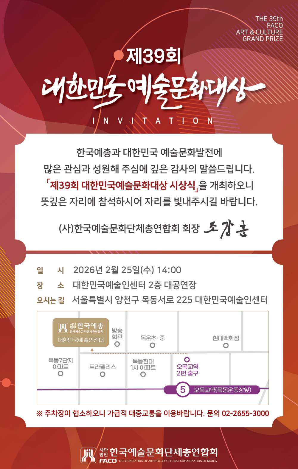 제39회 한국예총 대한민국문화예술대상 심사결과 작성일 2026.02.06 조회수 744 첨부파일 260205-제39회 대한민국예술문화대상 심사결과(게시용).hwp <제39회 한국예총 대한민국문화예술대상> 수상자 발표를 첨부와 같이 공지합니다. 예술 문화발전에 기여한 수상자분들께 다시 한 번 축하드립니다. 이전글 한국예총 소개자료 다운로드 안내 다음 게시물이 없습니다 목록