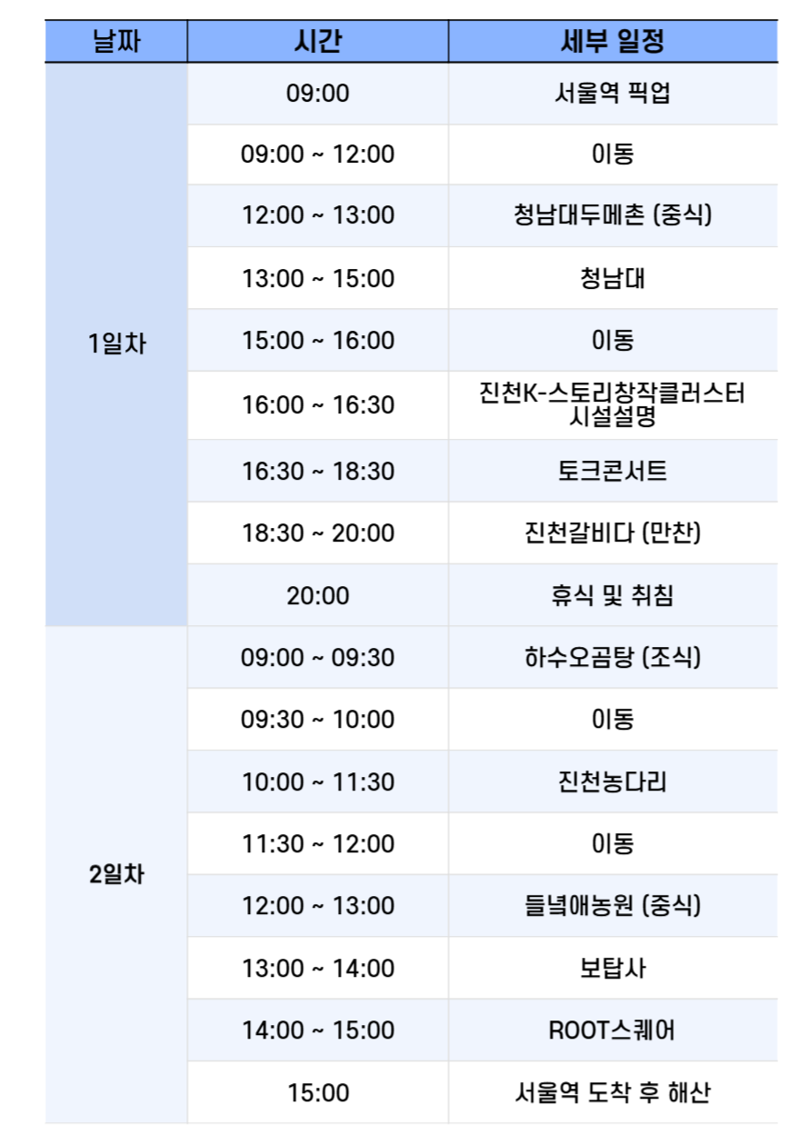 진행은 서울역 출발에서 1박2일 숙박, 서울역 회송까지 모두 무료입니다.