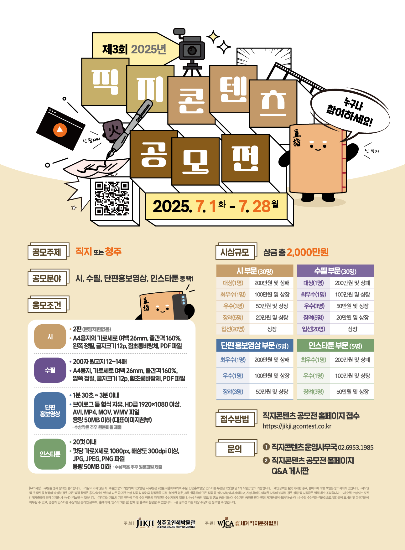 행사 제3회 직지콘텐츠공모전 주최·주관 세계직지문화협회 진행기간 2025.05.26 ~ 2025.06.26 작성일 2025.05.26 조회수 638 바로가기 이전글 광복 80년, 제9회 대한민국 국가상징 디자인 공모전 다음글 제27회 파주예술제 목록