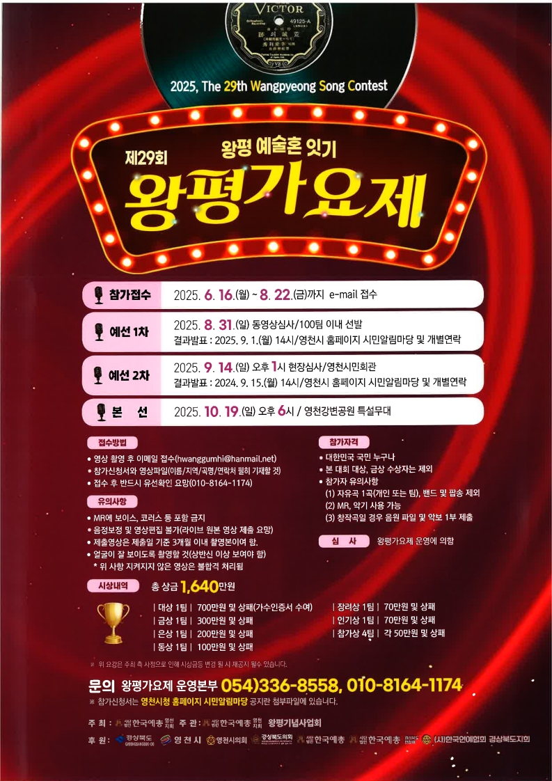 공모 제29회 왕평 예술혼 잇기 왕평가요제 주최·주관 영천예총 진행기간 2025.06.11 ~ 2025.07.11 작성일 2025.06.11 조회수 619 바로가기 이전글 제15회 하남예술제 다음글 2025 영동세계 국악 엑스포 목록