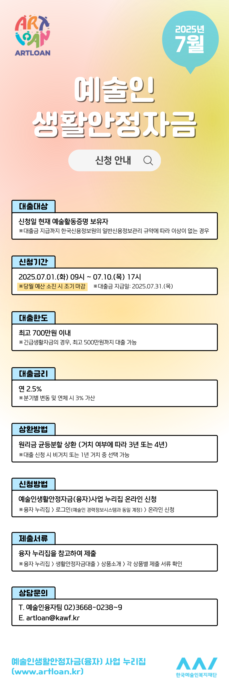 행사 2025년 7월 예술인 생활안정자 주최·주관 한국예술인복지재단 진행기간 2025.06.25 ~ 2025.07.25 작성일 2025.06.25 조회수 801 바로가기 이전글 2025년도 제74회 서울특별시 문화상 수상후보자 추천공고 다음글 2025 청소년 무대예술 페스티벌 목록