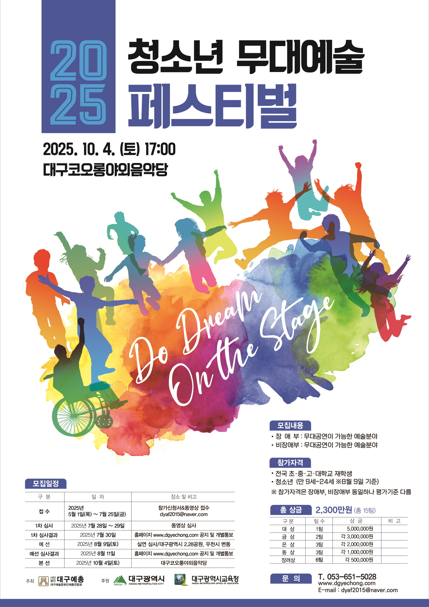 행사 2025 청소년 무대예술 페스티벌 주최·주관 대구예총 진행기간 2025.06.25 ~ 2025.07.25 작성일 2025.06.25 조회수 1562 바로가기 이전글 2025년 7월 예술인 생활안정자 다음글 제19회 세종대왕과 초정약수축제 목록