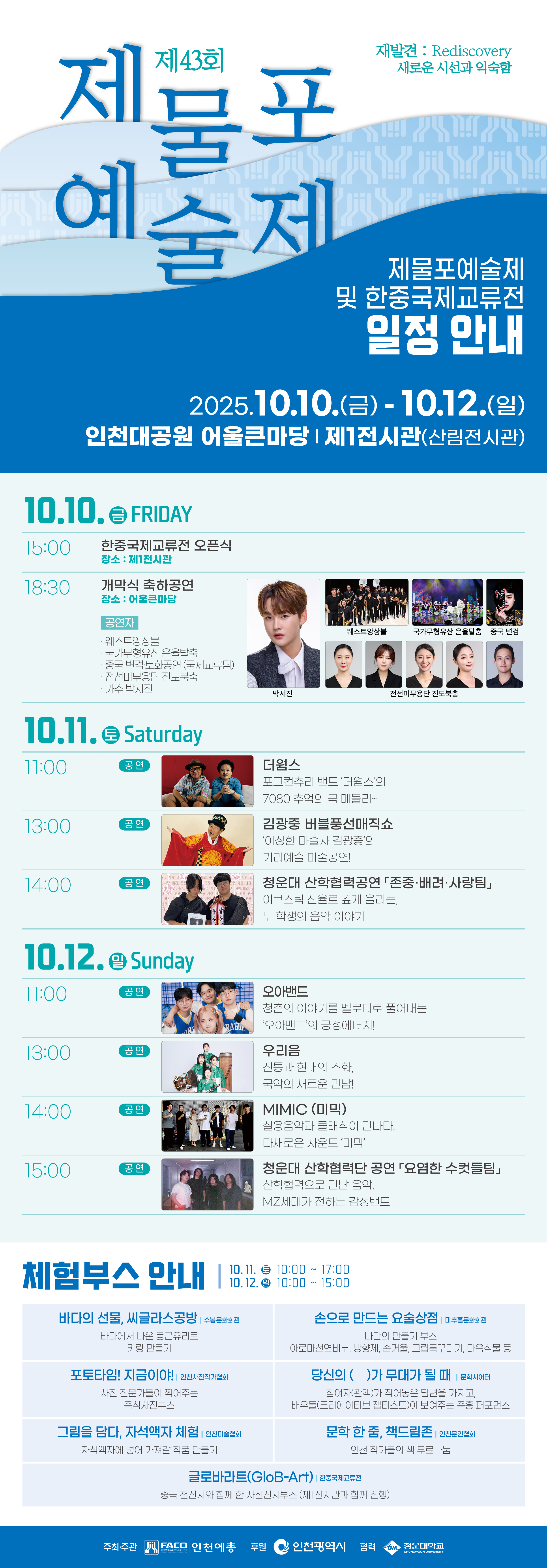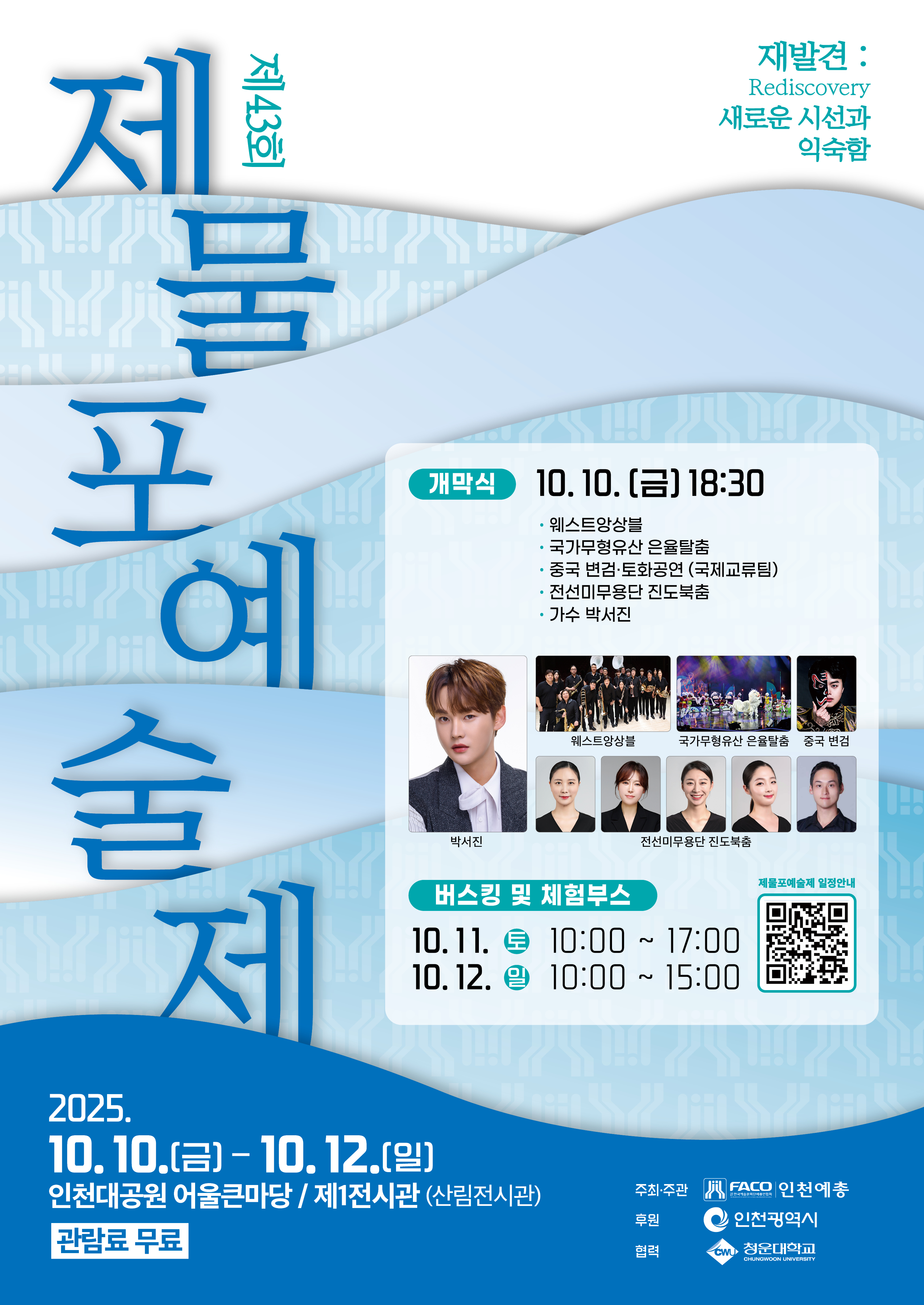 행사 [인천예총] 2025 제물포예술제 주최·주관 인천예총 진행기간 2025.09.17 ~ 2025.10.17 작성일 2025.09.17 조회수 503 바로가기 이전글 [인천예총] 2025 한중국제교류전 다음글 성남신촌 A2 미술작품 선정결과 공고 목록