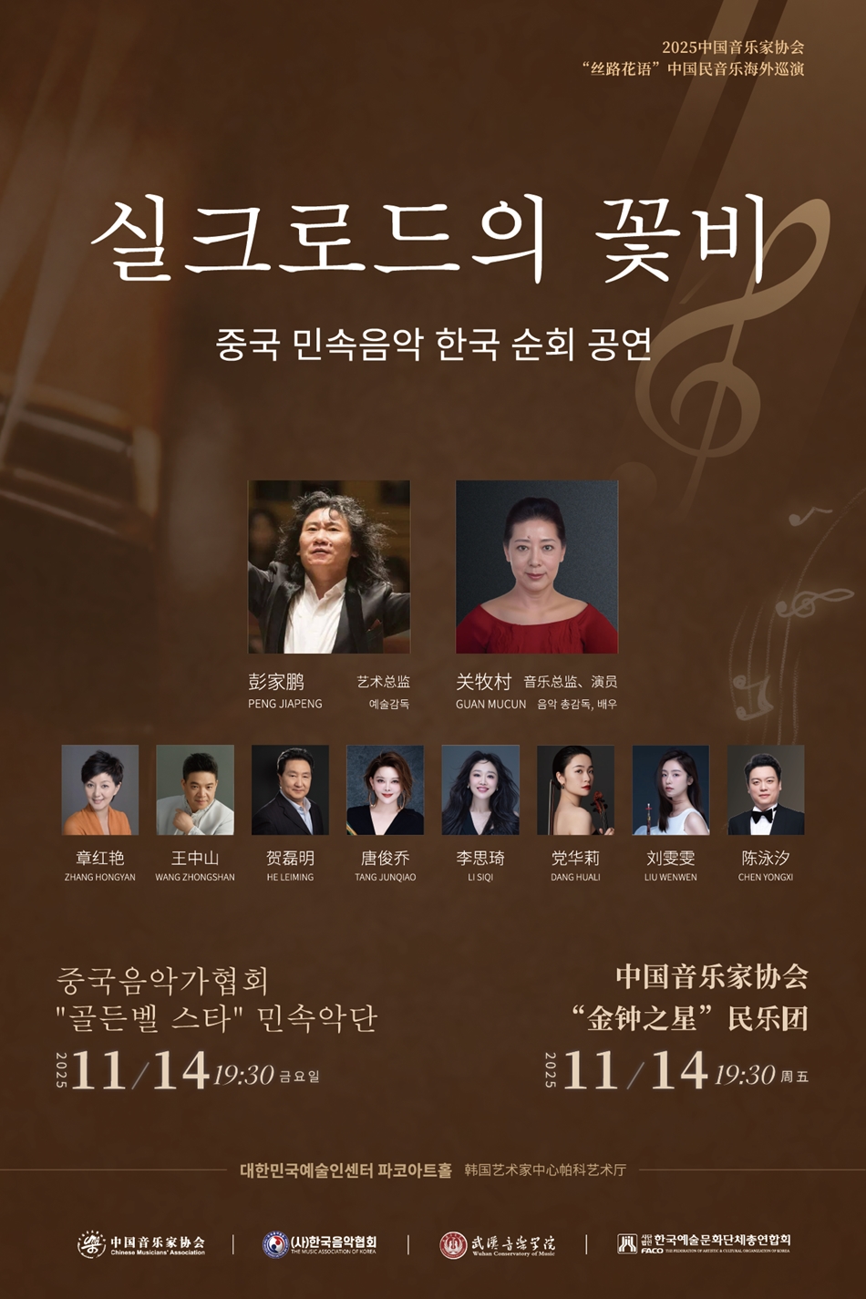 행사 '실크로드의 꽃비' 중국 민속음악 한국 순회 공연 주최·주관 한국음악협회 진행기간 2025.10.30 ~ 2025.11.30 작성일 2025.10.30 조회수 915 바로가기 이전글 [서울문화재단] 가야금, 판소리, 해금 명인 토크콘서트 <그 모든 날의 소리> 다음글 [호서대학교 중앙도서관] HCC 문화예술프로그램 나태주 시인 초청 인문학 특강 목록
