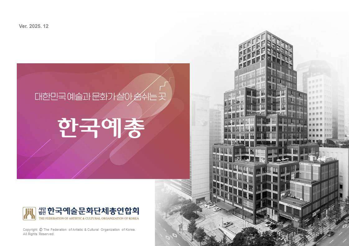 공지 한국예총 소개자료 다운로드 안내 작성일 2024.05.27 조회수 1555 첨부파일 한국예총 소개서 ver.2025.12.pdf 한국예총 소개자료는 상단에 첨부파일로 다운로드 받을 수 있습니다. ※ 상업적 용도로 사용 금지 이전글 한국예총 예술정기후원 프로젝트 다음 게시물이 없습니다 목록