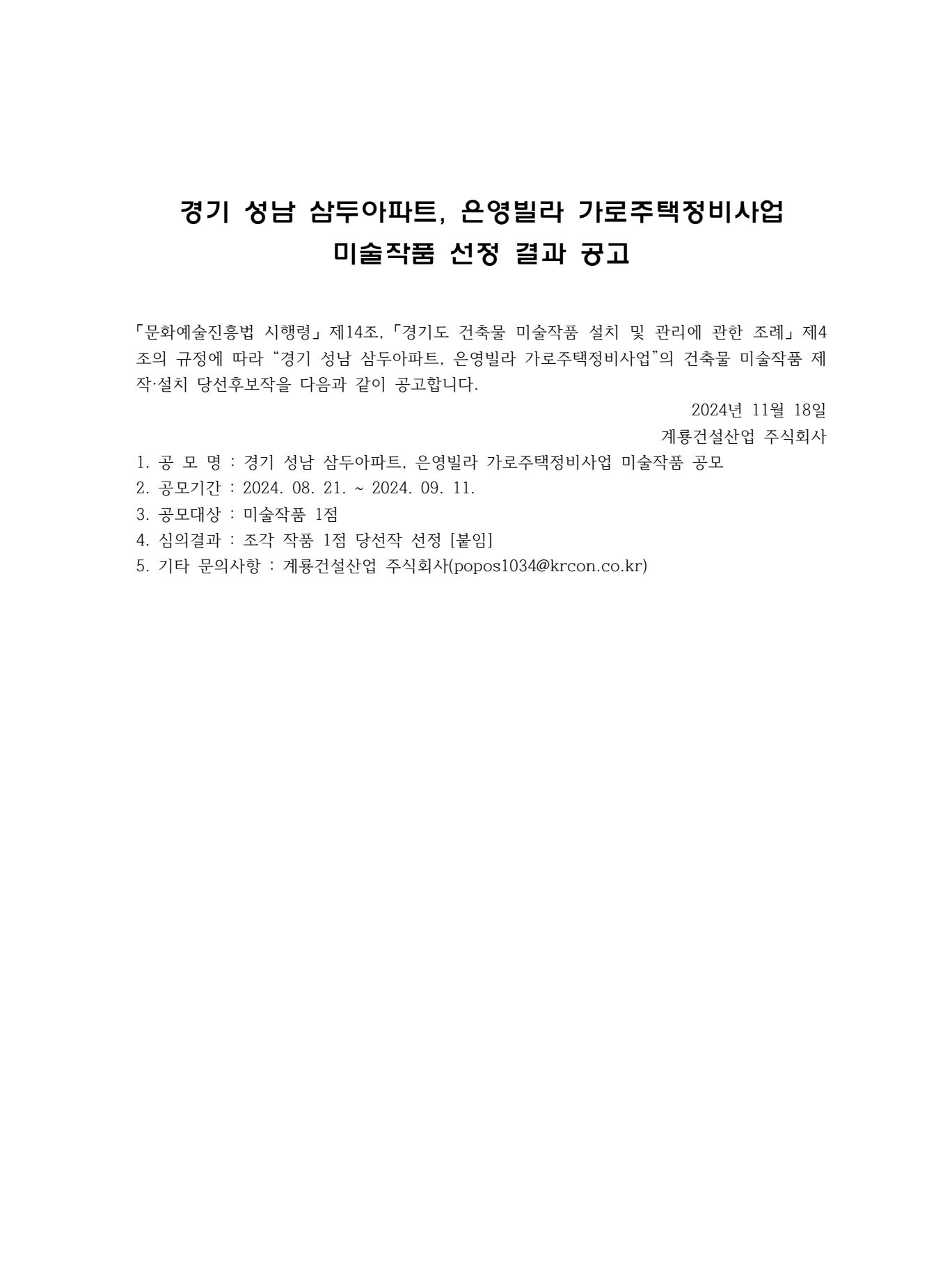 공모 경기 성남 삼두아파트,은영빌라 가로주택정비사업 미술작품 선정결과 공고 주최·주관 계룡건설 작성일 2024.11.19 조회수 715 바로가기 첨부파일 캡처1.JPG캡처1.JPG캡처1.JPG경기 성남 삼두아파트,은영빌라 가로주택정비사업 미술작품 선정결과 공고.hwp 경기 성남 삼두아파트,은영빌라 가로주택정비사업 미술작품 선정결과 공고 이전글 서호미술관 기획전 《다산, 강 따라 마주하다》 다음글 양주옥정 공공지원민간임대주택 A5 미술작품 선정 결과 공고 목록